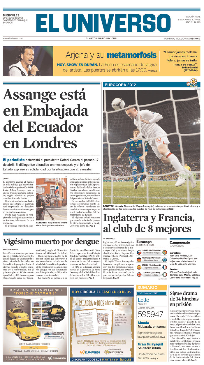 Front page of the day. Ecuadorian newspaper El Universo covers the news of WikiLeak’s founder Julian Assange asking for asylum from its country. The headline reads: “Assange in Ecuador’s embassy in London”.
