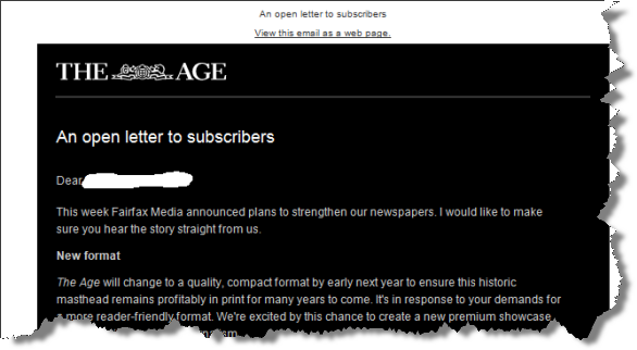 More on Fairfax. Some Fairfax subscribers were unimpressed to receive a personalised “open letter to subscribers” on the company’s sweeping cuts — four days after the official announcement. The letter by the CEO of Fairfax’s metro division Jack Matthews, which dropped into inboxes on Friday, starts by saying “I would like to make sure you hear the story straight from us”. The irony of this post facto comment, given that Fairfax’s business woes seem to stem in significant part from being slow to embrace the fast-paced online world, was not lost on some recipients. “It’s four days since it was announced, for goodness sake … no wonder it’s going down the gurgler,” one Fairfax subscriber wrote to Crikey.
