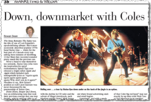 AFR reverses the Status Quo. Coles’ painful Status Quo promo may have come from left-field but we’re quite certain that the ageing rockers are right handed, something the Australian Financial Review missed this morning in a page 38 story where it appears the photo has been published as a reverse of itself.