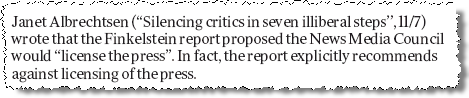 “Some observers have noted that Finkelstein was simply a rabid leftwing troll out to do the government’s bidding in an attempt to place a cloak of respectability on it’s attempts to muzzle the government’s media opponents. Finkelstein achieved these aims and more, by holding the inquiry and filling it with left-wingers. It’s been noted there wasn’t a single voice in the testimony to oppose the finkelstein restrictions on free speech. Finkelstein is a disgrace and the inquiry was a abject disaster for free speech in Australia. Some people suggest Finkelstein will end up being one of the most reviled men in the country if the government follows the advice contained in the report.”
