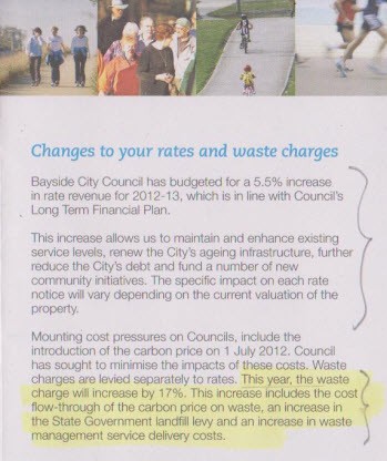 Carbon Watch. Coalition frontbencher Andrew Robb appears to have been caught out exaggerating the impact of the carbon tax on rubbish. A Crikey reader passed on this glossy pamphlet distributed to constituents by Robb, which warns that the Bayside City Council’s “waste management charges will increase 17 per cent to cover the flow-through costs of the carbon tax on waste”.