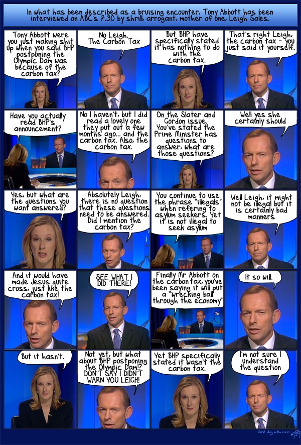 Was Tony Abbott accusing BHP of misleading the markets? While Tony knows for sure that it’s all about the Carbon Tax, BHP is coming up with all these pathetic excuses about industry-wide cost pressures, weaker commodity prices, instability in the Eurozone and slowdown of growth in China.