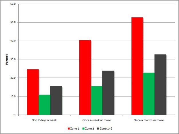 Proportion of Melbourne adults who use public transport, by frequency and fare zone (Source: ABS)