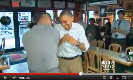 A good old-fashioned hug isn’t uncommon on the campaign trail, but Barack Obama probably didn’t expect to be lifted from the ground by Republican pizza shop owner Scott Van Duzer. “Everybody look at these guns,” exclaimed the President, seconds before Duzer returned the compliment with one almighty bear hug.