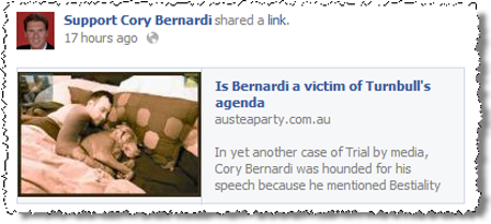 Intrigued, Tips signed the petition — under the name John Barking — but we haven’t yet received the details of other signees. We’ll keep you posted. You can watch a clip from Cory’s personal TV station here. We’ll leave you with this image from the Facebook page (we’re not quite sure how this helps the campaign to “fight for the traditional values” of Bernardi, but then we’re not in the heads of his supporters):