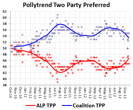 A drunk bloke shooting paintballs on a chart comes to mind with that particular graphic. So the vote of the government is intrinsically linked to satisfaction levels of the Prime Minister in the general case, and the public’s satisfaction or otherwise with the opposition leader of the day is really neither here nor there. It’s all about the government/PM dynamic as far as this goes, and how the opposition strategies and tactics operate within that constraint. So if you tear down the PM, the government’s vote will go with it — hardly rocket science, but it explains a lot.