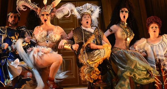 The glorious theme-park-cum-forum set and clever, campy costumes by Gabriela Tylesova are fantastic, and Andrew Hallsworth’s choreography is a perfect fusion of silly and slick.