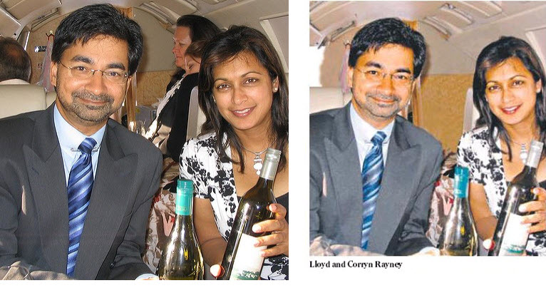 The Oz ran the airbrushed pic, which shows the Rayneys enjoying a glass of wine aboard a Hancock Prospecting flight, on Friday with its page three story on the acquittal of Lloyd Rayney over his wife’s murder.