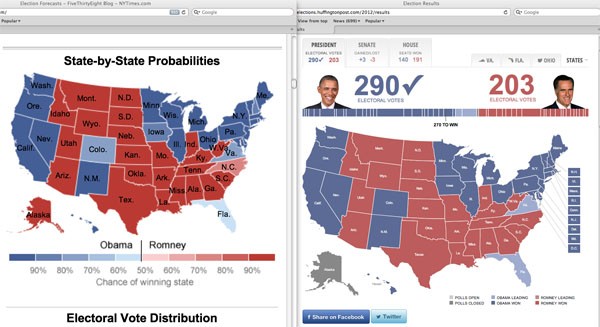 But reality won. Silver and co. came far closer to the final results than most of the pundits. Eg, see this jokey-ish Politico article, titled, “Election results 2012: Pundits who predicted right”.  But the great funny thing is most of them got it wrong. Of the 17 (inc. Obama’s African half-brother) only four said Obama would take over 300 votes. (And here’s their list of those who got it real wrong; ie Obama to lose, all of them Republican-identifying.)
