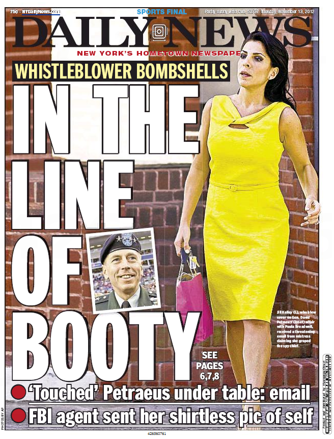 Front page of the day. There’s nothing the US tabloids love more than a good political s-x scandal — let alone one that involves the country’s (former) top spy boss David Petraeus. Here’s the latest punny effort from the New York Daily News: