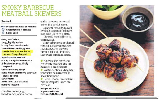 That’s not kosher. They don’t do things by halves over at the Herald Sun’s culinary department. Check out the bacon requirement for this recipe for meatballs, which appeared yesterday. Some people do dig their pig, but 25 bacon rashers per person?