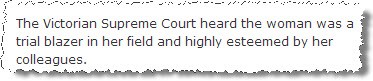 Now that’s court reporting. We’re not quite sure what the ABC means when a news photographer is described as a “trial blazer” — a gun at taking photos of alleged criminals perhaps? The boo boo was in this story about an Age photojournalist who is suing the newspaper for an estimated $1 million in relation to alleged difficulties she suffered from covering the first anniversary of the Bali bombings (the typo has since been fixed).