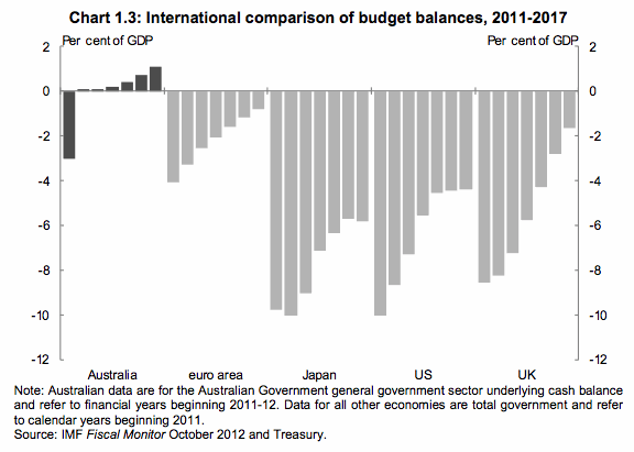 In this graph from the most recent Mid-Year Economic and Fiscal Outlook, you could flip each of those black bars for Australia around the other way and we’d still be well short of the debt levels of many of the world’s major economies. The only consequence might be — might be — that we’d lose that coveted triple-A credit rating and send central banks and foreign investors elsewhere in the search for a safe haven currency, thereby sending the Australian dollar back below parity.