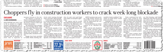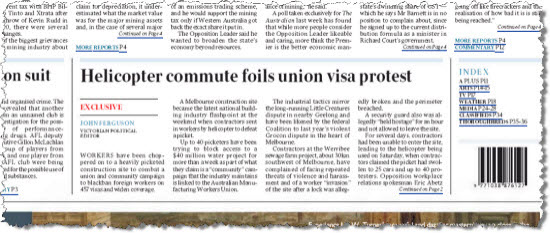 Exclusive Watch. When is an exclusive not an exclusive? This morning The Age and The Australian both ran front-page “exclusives” on an industrial dispute, reporting a Melbourne construction contractor was forced to use a helicopter to bring workers on site and break a picket line on Saturday.