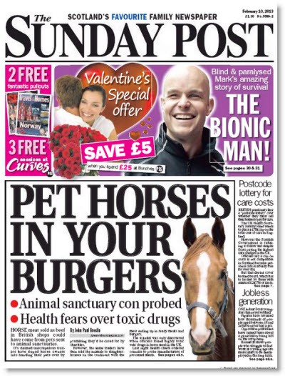 Front page of the day. In case Europe’s breaking story about horse meat sold as beef confuses you, The Sunday Post spells it out in yesterday’s headline and picture.