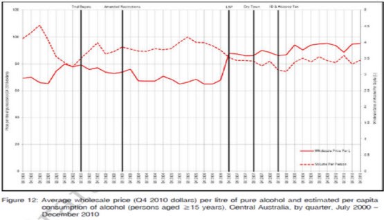 There have been some very effective population wide measures in place in the NT, such as the de facto alcohol floor price in Alice Springs, achieved by a combination of Licensing Commission action — against selling wine casks larger than two litres — and an agreement operating amongst liquor retailers not to sell bottled wine for less than $8 per bottle and two litre casks for less than $16. This has seen the minimum price increase from 25 cents per standard drink to around 76 cents per standard drink.