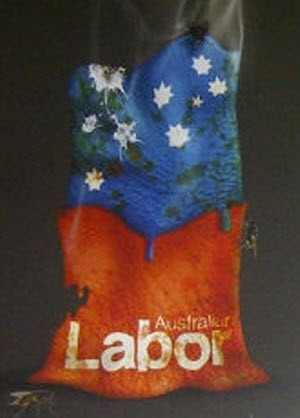 We’re agog at the creativity behind the depiction of the Labor logo (we’ve blown it up for you below). Is that a burning tree stump, complete with bird poo? Is it a cigarette but? What is the mysterious stain at the base? Tips loves poring over election propaganda, so please send in more from WA here. Has Treasurer Troy Buswell been on the (advertising) offensive?