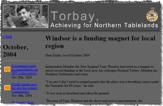 Torbay has been the independent member for the Northern Tablelands in the NSW Legislative Assembly since 1999. He’s won preselection for the Nationals to take on kingmaking independent Tony Windsor for the federal seat of New England this year. So we read this Torbay media release from 2004 with interest: