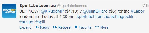 Sportsbet welching on spill bets? It wasn’t only political junkies getting excited about the prospect of a leadership challenge yesterday afternoon. Sportsbet, as is its wont, got in on the act by encouraging punters to have a bet on the outcome: