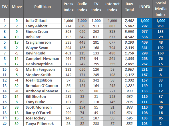 Gillard and Abbott continue to occupy most of the social media conversations. And despite coming third here, K-Rudd’s social media ranking has dropped substantially. Could it be his time as Twitter God is over now that his relevance is more tenuous than ever?