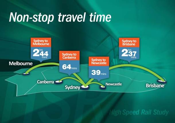 It would be necessary to change trains at Central to go by HSR from Melbourne or Canberra to Newcastle, Coffs Harbour, the Gold Coast and Brisbane South (a new station) and a new concourse beside the existing main Roma Street station.