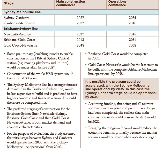 The busiest parts of the Melbourne-Brisbane system could be ready as soon as 2030 for Sydney-Canberra, and 2035 for Sydney-Melbourne if the fastest plausible project times were allowed.