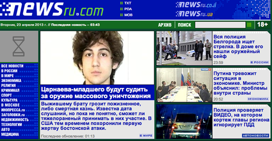 The country’s media coverage on the Russian connection to the Boston terrorist acts has been tame and matter-of-fact: “FBI discovers Russian connection”, “Youngest Boston terrorist Tsarnaev taken alive”, “Tsarnaev now awake and talking to the authorities”. The tabloid site news.ru.com (above) reads: “Youngest Tsarnaev will be charged with using weapons of mass destruction”.