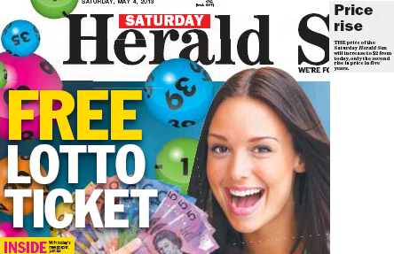 Everyone’s a winner! Excited to receive a free lotto ticket with you Saturday Herald Sun? Of course you were! It might even have distracted you from the fact that the paper’s cover price went up 25%. Not that the paper was pushing that side of the equation too strongly … here are the two announcements, to scale: