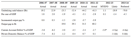 Source: ABS Government Finance Statistics, Australia, 2011-12; ABS National Accounts, ABS Balance of Payments. The incremental output gap is defined as the percentage departure from trend growth (2000-2008) of 3.1% per annum.* Treasury estimate of external deficit in 2012-13. (a) My estimate. (b) Computed value implied from national accounting conventions. “Likely” denotes my estimation of the May 14 budget. “Preferred” denotes the figures if my proposals were enacted.