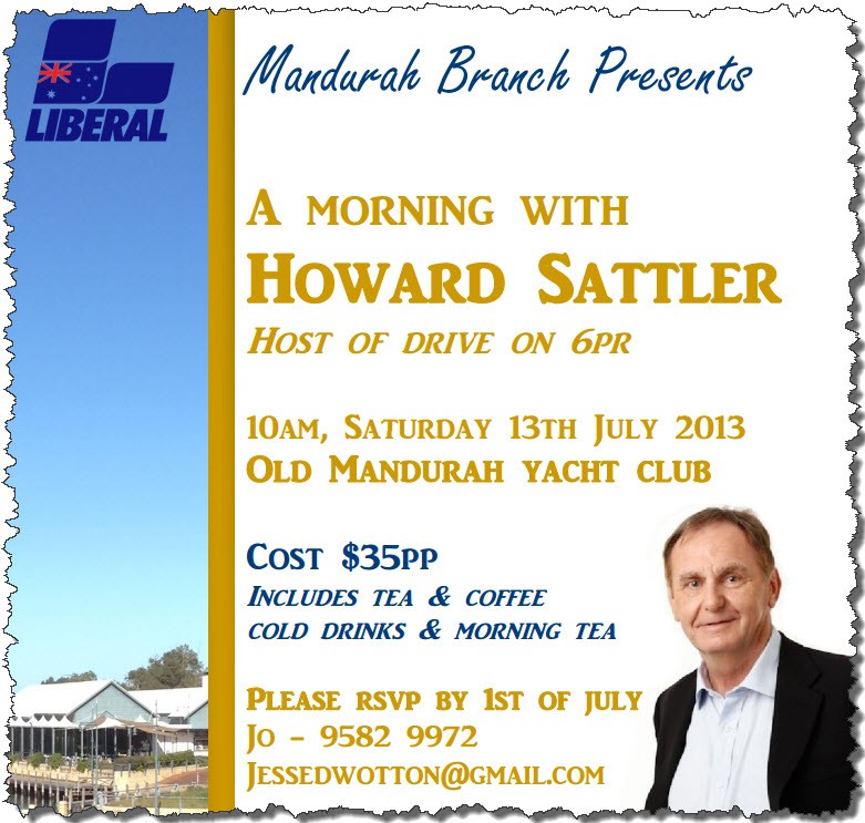 Sattler shafted … again. Sad news for Liberal Party members in Perth who stumped up $35 to have tea and bickies with sacked 6PR radio announcer Howard Sattler in July. Crikey hears the organisers quickly pulled Sattler from the event last week after he quizzed the Prime Minister on whether her hairdresser partner Tim Mathieson is gay.