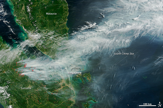Over the past fortnight, haze from Indonesian forest fires has covered Singapore. The island state’s Pollution Standards Index rose to an all-time high of 401 on June 21 — anything above 300 is considered hazardous to human health. This comes with a recommendation that residents, particularly children, the elderly and others vulnerable to respiratory disease, “avoid unnecessary outdoor activity”. Schools and airports in some Asian countries have been closed. The smoke can be seen in the above satellite image from NASA.