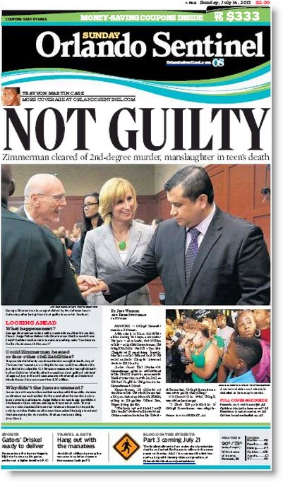 Front page of the day. The Sunday Orlando Sentinel — which has been covering the trial in Sanford, Florida, that received national attention — needed just two words on its front page …