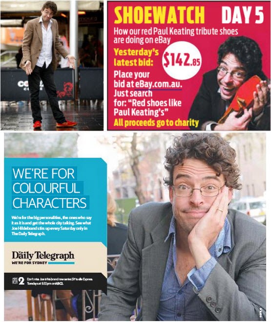 The Daily Telegraph‘s something-less-than-handsome hack Joe Hildebrand is in serious danger of over-exposure. For the record, those ruby slippers — genuine knock-offs of the shoes Paul Keating was sporting last week, as exclusively revealed in the Tele — haven’t budged from the $142.85 mark on eBay. According to the seller notes: