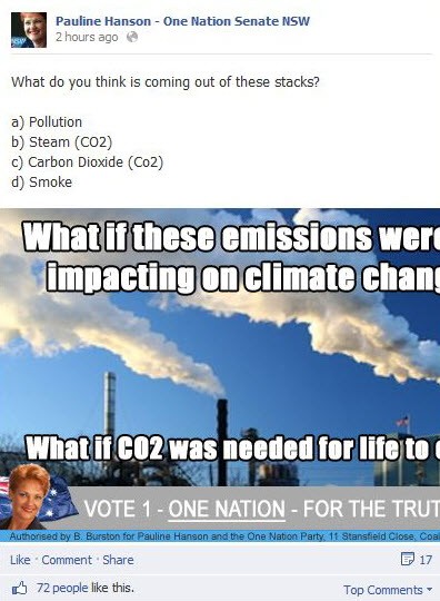 Hanson weighs in on climate change. Back to school, Pauline. This question has been posted on her official Facebook page: