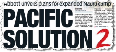 Today it is Opposition Leader Tony Abbott’s turn, as he has unveiled his plan to build a 2000-tent city on the site of the riot-destroyed Nauru refugee detention facility. Abbott’s plan isn’t a “hellhole” apparently, with the Tele opting for the more neutral “Pacific Solution 2”. The story begins: “Housing thousands of people in tents and leaving refugees in Nauru’s slum district on small welfare payments indefinitely are the centrepieces of the Coalition’s offshore asylum policy …” Yes, there are slums in Nauru, but the Tele reckons it’s not a crime-ridden hellhole.