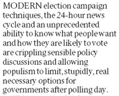 “Climate of fear killing off policy” in The Australian has Dennis Shanahan explaining how modern campaigning has reduced both sides to media slaves, scared of real reform.
