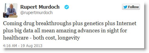 Murdoch in for the long haul. There’s plenty of interest in what happens to News Corp when Rupert Murdoch passes on. He’s aged 82, and we’d just point out that’s older than average life expectancy for Australian males (of course, Rupert is not an Australian citizen). Murdoch doesn’t seem to be slowing down with age, and his mother made it to be 103. And from the look of this tweet today, Rupert is keeping a close eye on how to achieve longevity … will he be around for decades to come?