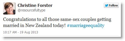 Awkward. Liberal councillor Christine Forster, who has a female partner, is tweeting her support for same-s-x marriage. Interesting, given she’s Tony Abbott’s sister (Abbott does not support same-s-x marriage and did not allow a conscience vote on the issue).