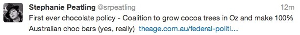 Regarding the “chocolate policy” to subsidise Cadbury’s factory in Tasmania and “plant cocoa trees in Oz”: