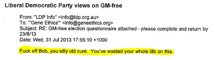 Over at Gene Ethics, they decided to ask the major parties (and some minor ones too) what their policies on GM foods are. You can find the parties’ replies and questionnaire results here, but scroll to the end to find this colourful message from the Liberal Democratic Party:
