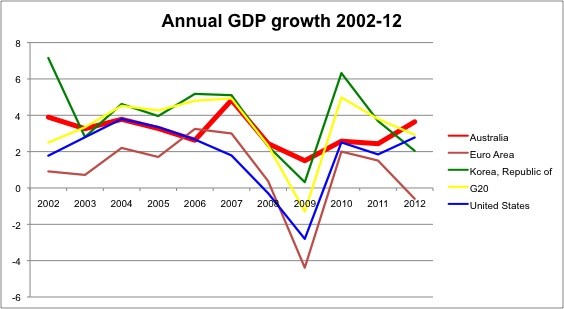 Labor’s performance on economic growth has been a strong one compared internationally. Although we trailed high-growth economies like South Korea and the broader G20 grouping for much of the last five years of the Howard government, Labor maintained growth during the financial crisis, when we critically avoided two quarters of negative growth. After the GFC Australia performed more strongly than most other developed economies, certainly in comparison with the eurozone, which has endured a depression, and the United States, which is only now starting to recover from the deep slump that began in 2007. Also notice that Australia’s out-performance of the eurozone and the US didn’t begin with the financial crisis, but in the last year of the Howard government.