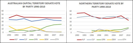 The two territories have each been represented by two Senators since the 1975 election, following Whitlam government legislation which survived High Court challenges in 1975 and 1977. Whereas the state’s Senators serve six year terms which are fixed but for the possibility of a double dissolution, the territory Senators’ terms are tied to the House of Representatives, so that the Senators facing re-election had likewise done so in 2010.