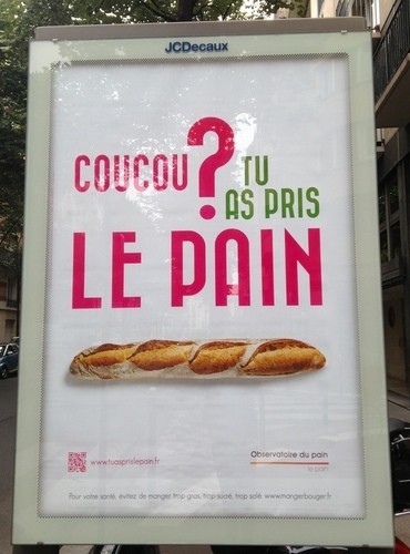 - Got baguettes? Bakers’ lobby tells France to eat more bread — “The average French person consumes just half a baguette a day, down from a full baguette 40 years ago. Those statistics worry the French bakers’ lobby the Observatoire du Pain [that] came up with the slogan, ‘Cou cou, tu as pris le pain?’ which translates roughly as, ‘Hi there, did you pick up the bread?'”