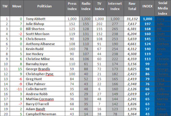 The volume of media coverage for Prime Minister Tony Abbott this week is more than four times greater than the next in line, Foreign Affairs Minister Julie Bishop, who garnered headlines on two fronts: debuting as chair of the United Nations Security Council in New York and for her dealings with the Indonesian government on asylum seeker policy.