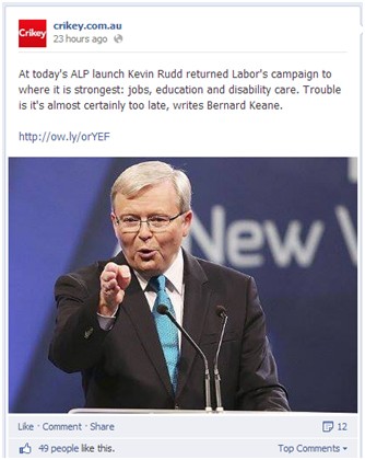 For example, Crikey’s Facebook fans largely consist of left-leaning 25-44 year-olds. A story about injustices suffered by asylum seekers, if described in the right way, generally generates a lot more traction than, say, one about a successful business initiative. Conversely, on SmartCompany, a story about a successful policy implemented by the Coalition is more likely to resonate.