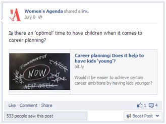 But Crikey Facebook users would be reluctant to like and share it (it is also not really what the essence of the story was about). Users of an anti-abortion Facebook page would likely have responded quite differently, and this is where understanding our audience comes into play. By adding one final sentence, this update was able to gain traction, fly to the top of News Feeds and get great circulation. Here’s the complete post: