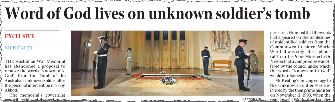 Devine timing on war memorial. How very curious. The Daily Telegraph‘s Miranda Devine and The Australian‘s Nick Cater both have the same “exclusive” story today: the Australian War Memorial, led by former Coalition defence minister Brendan Nelson, has scrapped a plan to remove the words “known unto God” from the tomb of the Unknown Soldier. The phrase was to have been replaced by a quote from former prime minister Paul Keating, but the Abbott government overruled the War Memorial council’s decision. Devine and Cater’s work usually appears in the op-ed section rather than the news pages, making the stories even more intriguing.
