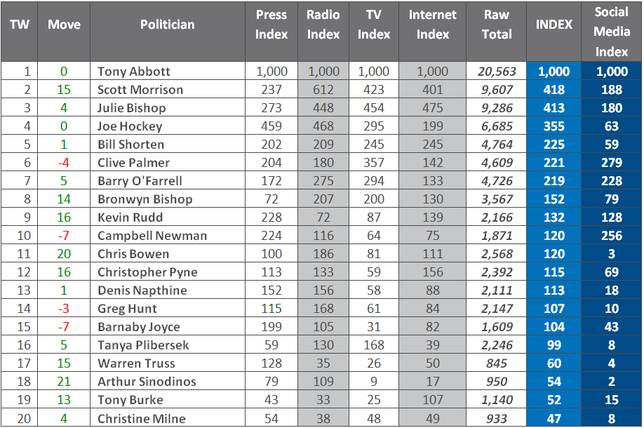 Tony Abbott bounces back to a more prime ministerial lead in the numbers this week, up 50% from last week’s hide and seek effort. Nevertheless a lot of the coverage was about what the Government is trying not to talk about, with number two and three on the list, Scott Morrison and Julie Bishop, having a hot week trying to fend off discussion about the deteriorating relationship with Indonesia following spying claims and the failure to turn around a number of asylum seeker boats.