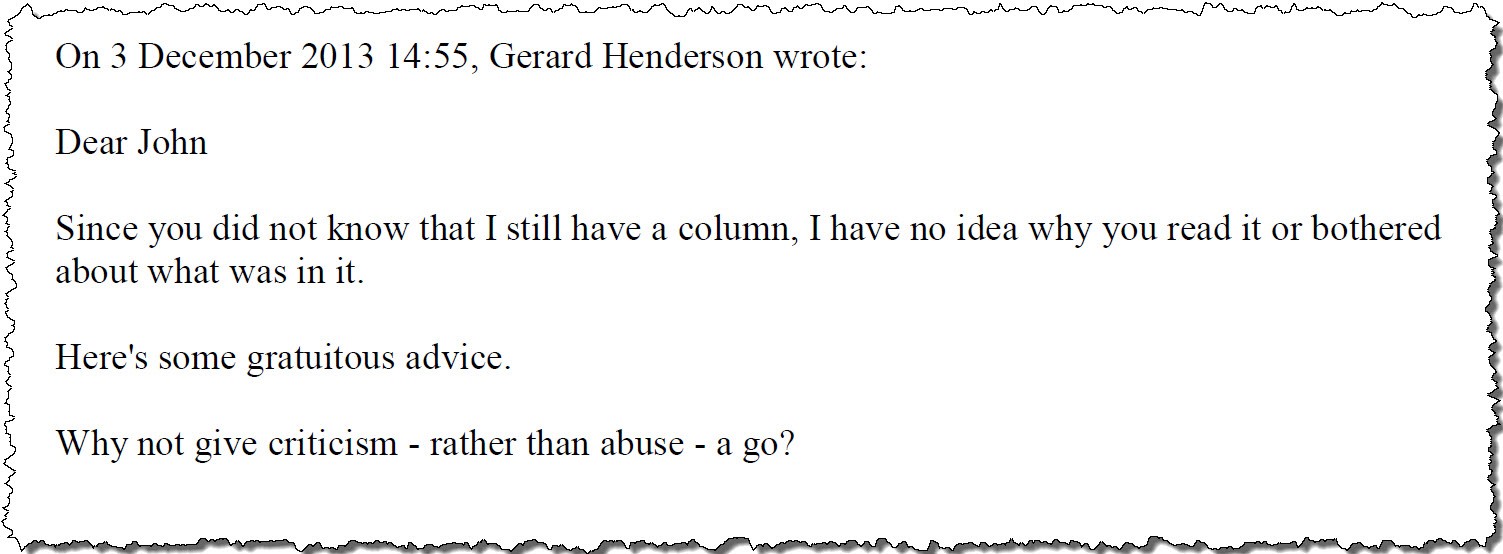 It all kicked off on Tuesday when Henderson took aim at JVT in his regular Sydney Morning Herald column. Hendo was incensed at the use of “frattish, undergraduate language” in the latest Monthly editorial (van Tiggelen called the Abbott government a “frat party of Young Liberals who refuse to grow up” and decried the party’s “onanistic reverence for John Howard”). He was also unimpressed by The Monthly‘s Cut & Paste spoof lampooning The Australian‘s foreign editor Greg Sheridan for his commentary on close mate Tony Abbott. In response, van Tiggelen fired off an email to Henderson, which led to a delightful e-stoush we’re more than happy to republish. After all, why should you have to wait until Friday’s Media Watch Dog?