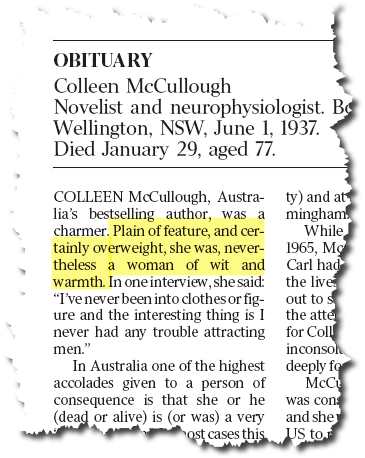 Seriously? We know obituaries are written far in advance, but was this one written in Regency England? The Australian today (page 9) on the death of Australian author Colleen McCullough …